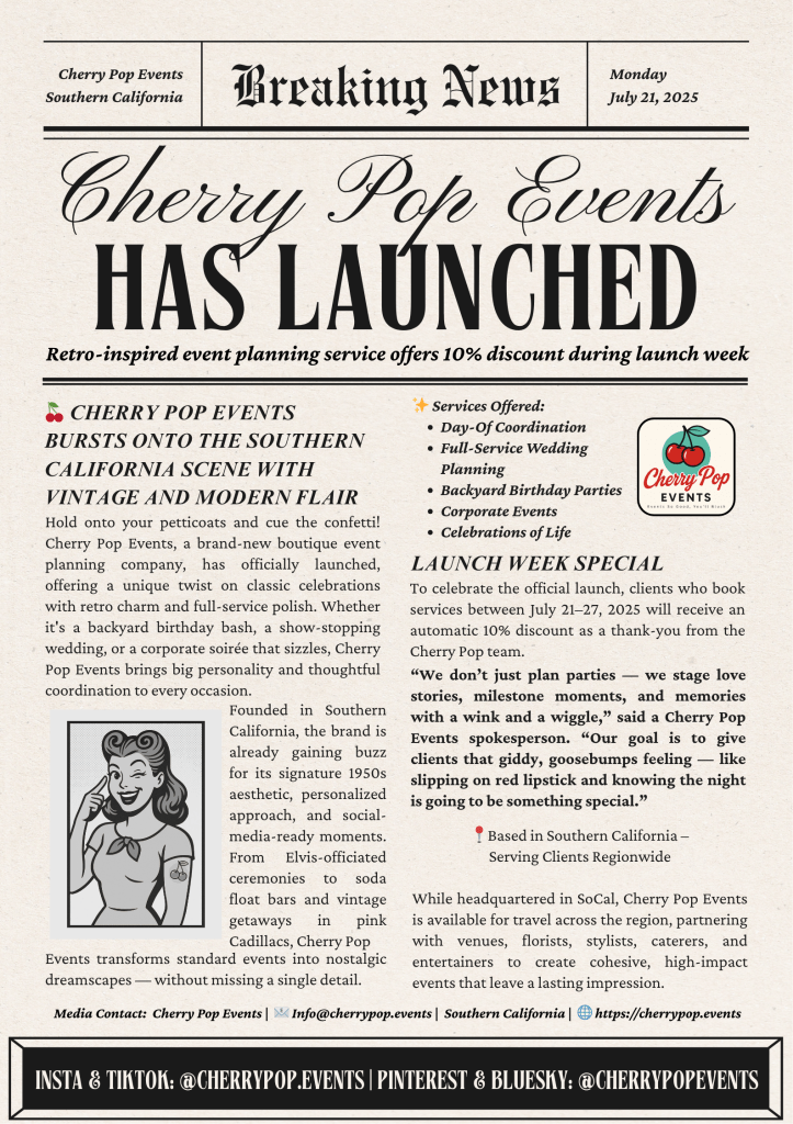 Well butter my biscuit and break out the bubbly — Cherry Pop Events has officially waltzed onto the scene, heels clicking and lipstick fresh, ready to shake, rattle, and roll your special day into one unforgettable bash!