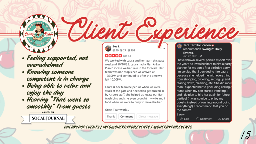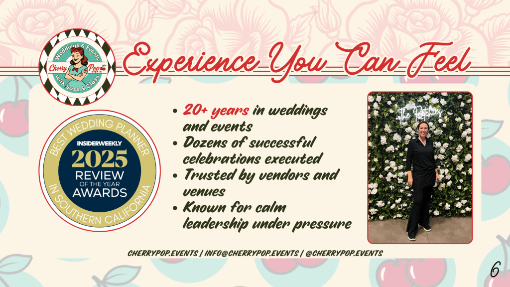 Feast your peepers on the glitz, the glam, and the โoh-my-starsโ moments weโve whipped up across sunny SoCal. From swanky soirรฉes to backyard blowouts, candlelit weddings to corporate shin-digs with sparkle โ weโve planned โem all, baby.